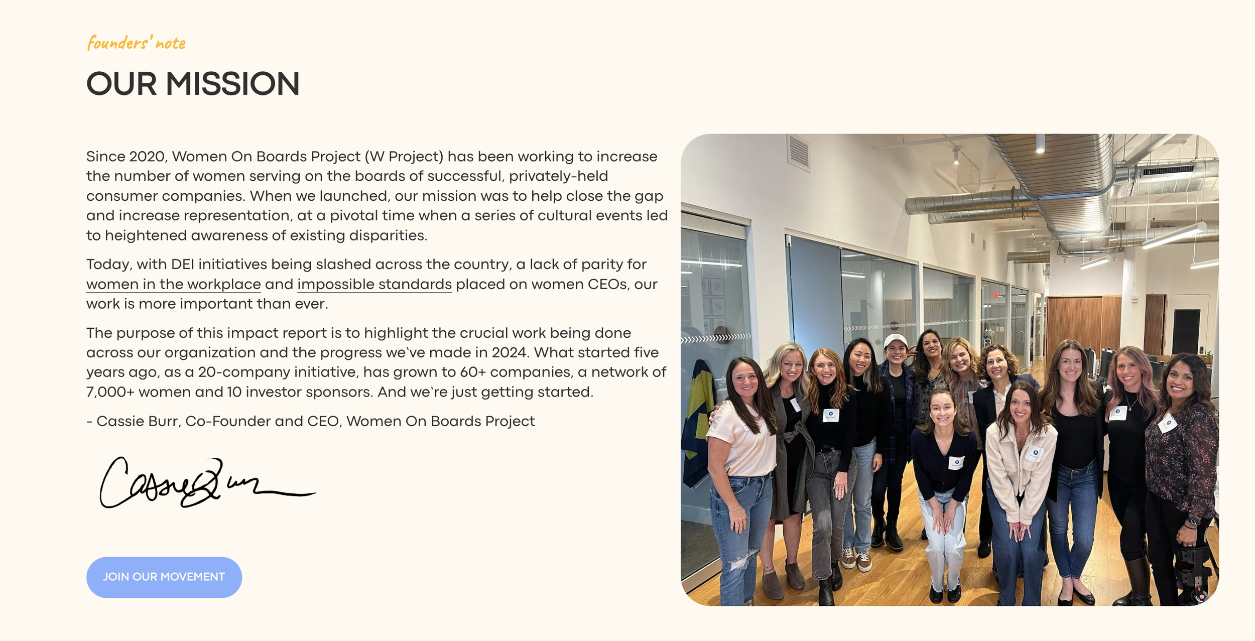 In 2024, only 28% of board seats were occupied by women. Women On Boards Project is a mission-driven organization dedicated to changing this.